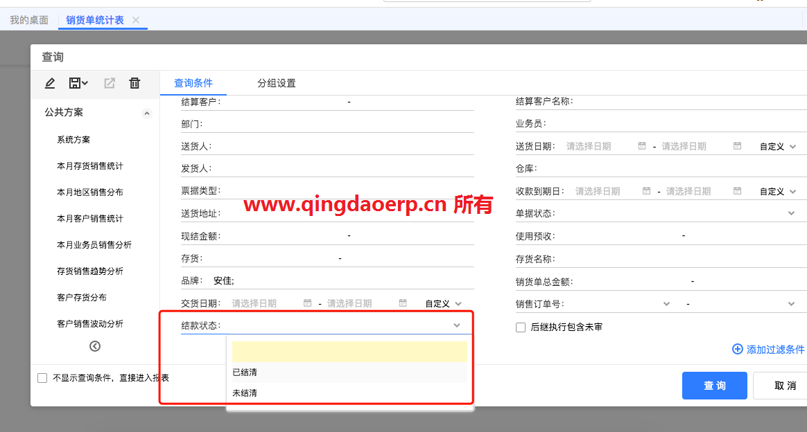 用友T+軟件如何查詢銷貨后的結(jié)款情況,在銷貨統(tǒng)計表的查詢界面選擇:結(jié)款狀態(tài)--已結(jié)清和未結(jié)清