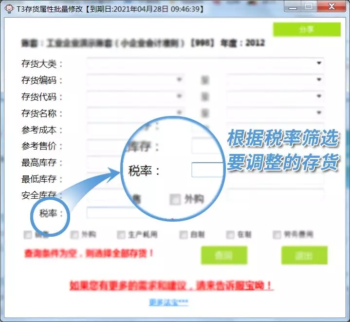 服寶有話說:由于T3中暫時不支持存貨屬性的批量修改,當(dāng)企業(yè)的存貨種類較多,數(shù)量龐大時,修改稅率也許要花好幾天時間。軟件暫時沒有批量修改,如果了解數(shù)據(jù)庫的可以在數(shù)據(jù)庫進(jìn)行調(diào)整