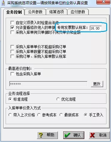 2. 修改采購發(fā)票稅率。在【采購 -- 采購業(yè)務(wù)范圍設(shè)置 -- 業(yè)務(wù)控制】頁簽下修改“專用發(fā)票默認(rèn)稅率”;
