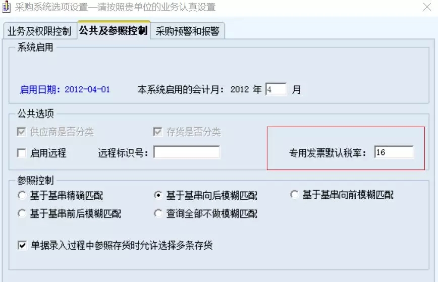 2. 修改采購發(fā)票稅率。依次點(diǎn)擊【采購管理 -- 設(shè)置 -- 其他設(shè)置 -- 采購選項】,在“公共及參照控制”頁簽下修改“專用發(fā)票默認(rèn)稅率”的值;