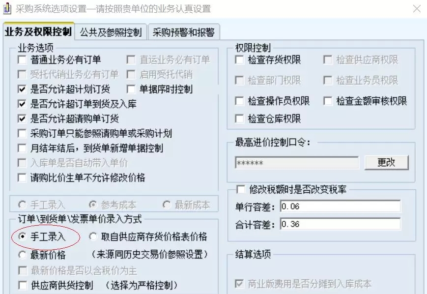 檢查【業(yè)務(wù)及權(quán)限控制】頁簽下的“訂單\到貨單\發(fā)票單價錄入方式”,此處需勾選“手工錄入”,這樣才能把存貨檔案的稅率帶到表體明細(xì),不然會出現(xiàn)表頭稅率是新修改、表體稅率還是舊的情況。