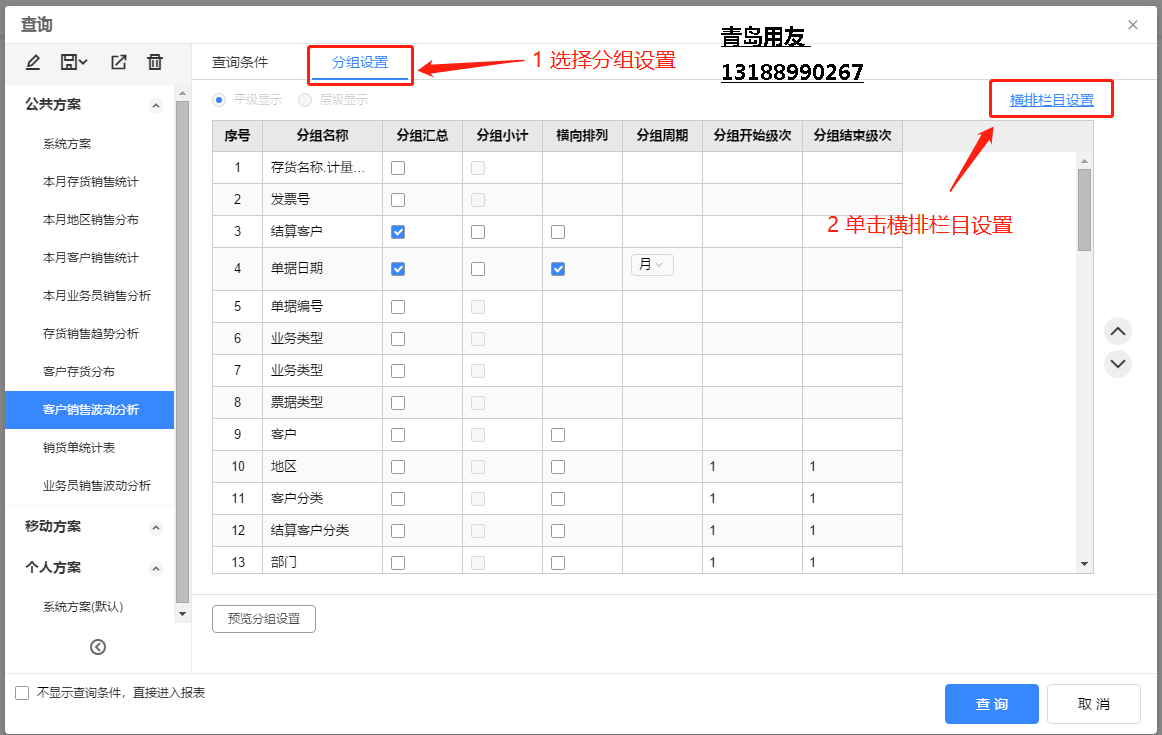 1、打開(kāi)銷(xiāo)售單統(tǒng)計(jì)表的查詢界面,選擇客戶銷(xiāo)售波動(dòng)分析,點(diǎn)擊分組設(shè)置,再點(diǎn)擊橫排欄目設(shè)置。